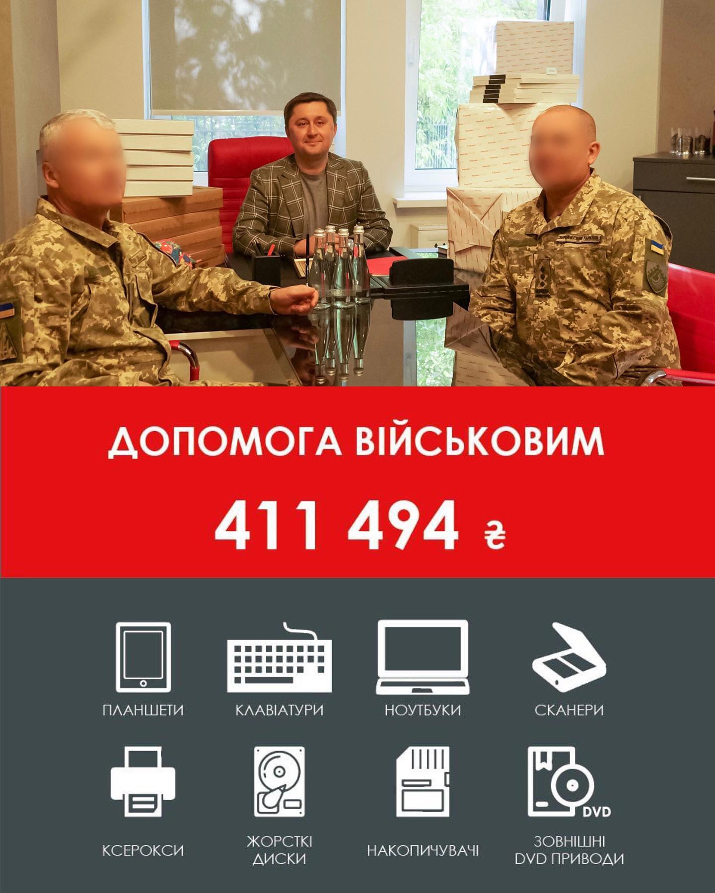 Як випливає з повідомлення, компанія надала військовим такого обладнання як планшети, ноутбуки, сканери, ксерокси, жорсткі диски тощо на загальну сумму 411,5 тис. грн.