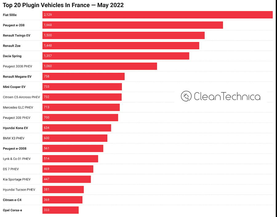 Продажі BEV зросли на 38% в порівнянні з травнем 2021 року, а реєстрації PHEV знизилися на 13%. В цілому авторинок Франції продовжує падати, скоротившись на 10% в порівнянні з травнем 2021 року та на 35% у порівнянні з аналогічним місяцем 2019 року.