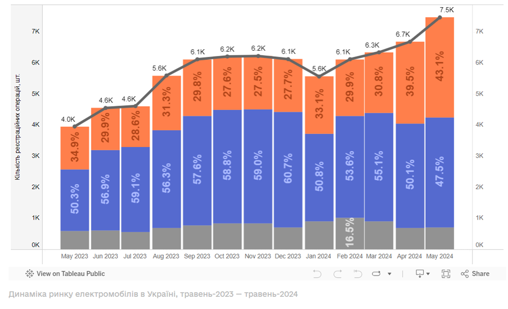 З-за кордону було привезено 3546 вживаних електрокарів, що становить 47,5% від загальної кількості реєстрацій. На внутрішньому ринку було укладено 3216 угод купівлі-продажу електромобілів, або 43,1%. Новими українці купили 9,4% електричних авто (705 од.). Після рекорду у лютому, коли кількість нових електромобілів перевищила 1 тис. од., продажі нових авто продовжують потроху знижуватися.