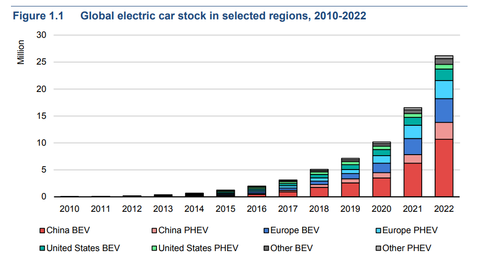 Як зазначається у звіті Global Electric Vehicle Outlook, у 2022 році у світі було продано понад 10 млн електромобілів. Агентство очікує, що цього року продажі зростуть ще на 35% і досягнуть 14 млн од. Таке зростання означатиме, що частка електромобілів збільшиться з приблизно 4% у 2020 році до 14% у 2022 році та, згідно з останніми прогнозами МЕА, – до 18% у 2023 році.