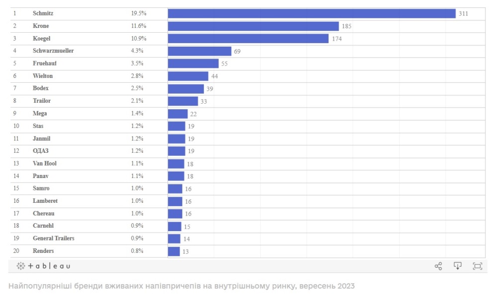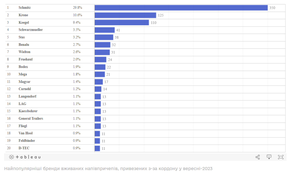 Першим в переліку найпопулярніших вживаних напівпричепів, привезених з-за кордону, був бренд Shmitz. Його частка становила 29,8% (350 шт.). Друге місце посів бренд Krone (125 шт., 10,6%). На третьому місці розташувався Koegel (110 шт., 9,4%), а на четвертому – Schwarzmueller (41 шт., 3,5%). Замикає п’ятірку Stas (38 шт., 3,2%).