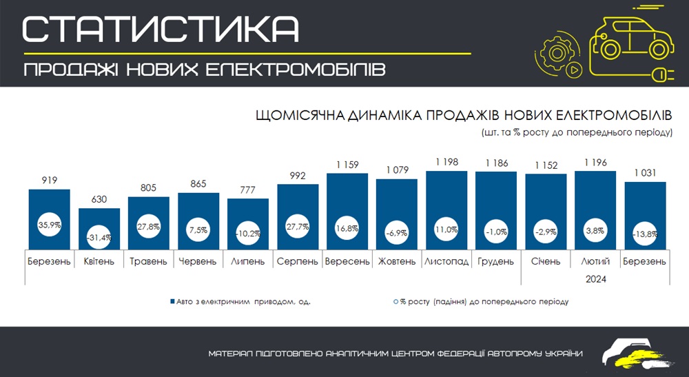 У кількісному вираженні у березні було продано 1031 нових електромобілів, що на 13,8% менше, ніж у попередньому місяці. Але порівняно з березнем 2023 року продажі зросли на 12,2%.