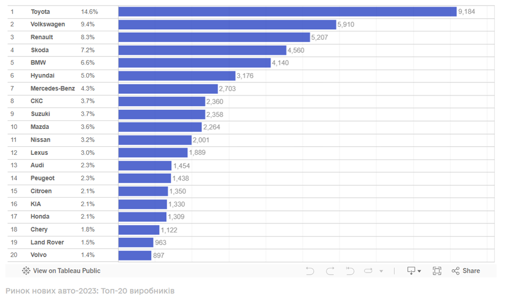 У 2023 році найбільших успіхів у торгівлі новими авто вдалося досягти дилерам Toyota. На цей бренд припадає 14,6% продажів, або 9,2 тис. легковиків. На другому місці — Volkswagen з часткою 9,4% (5,9 тис. авто). При цьому варто зазначити, що автомобілі цієї марки до категорії нових потрапляли не лише від офіційних дилерів, а й від незалежних, які здебільшого ввозили електричні кросовери сімейства ID з Китаю.
