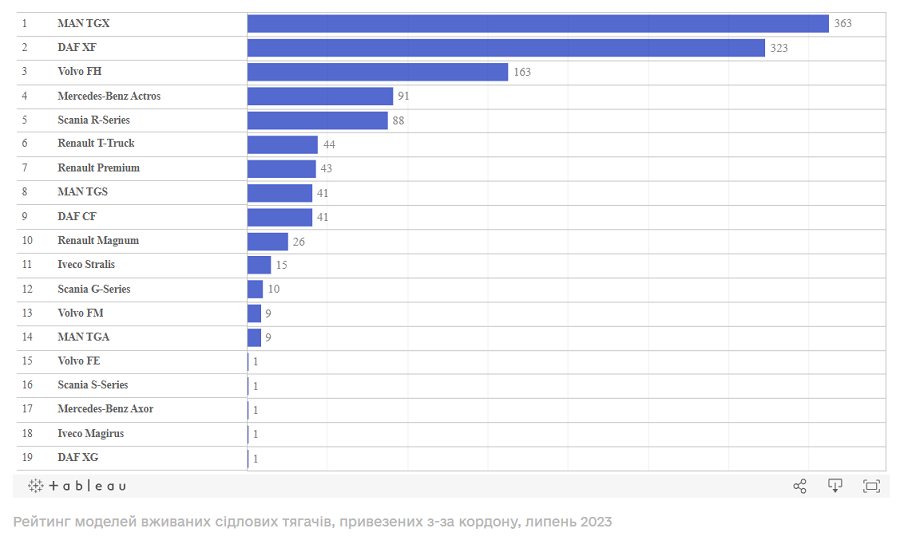 У липні, як і уже багато місяців поспіль, з-за кордону найбільше привозили вживані MAN TGX (363 шт.). На другому місці знаходиться DAF XF (323 шт.), а на третьому – Volvo FH (163 шт.). Четверту сходинку посів Mercedes-Benz Actros (91 шт.), а замикає першу п’ятірку Scania R-Series (88 шт.).