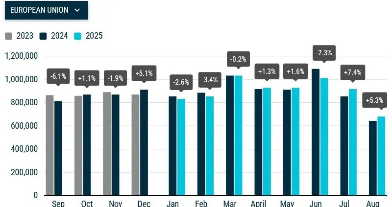 У серпні 2025 року ринок нових автомобілів у Європейському Союзі продемонстрував зростання: кількість реєстрацій збільшилася на 5,3% у річному вимірі та досягла майже 677,8 тис. одиниць.