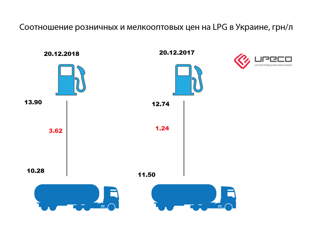 20 декабря средняя розничная цена на сжиженный газ в Украине составила 13,90 грн/т. Таким образом, разница между оптом и ценами на заправках достигла 3,62 грн/л или 35,2%. По состоянию на 20 декабря 2017 года разница между оптовыми и розничными ценами достигала 1,24 грн/л. При этом участники рынка отмечают, что импортный ресурс в начале декабря растомаживался по цене около 9,30-9,50 грн/л.