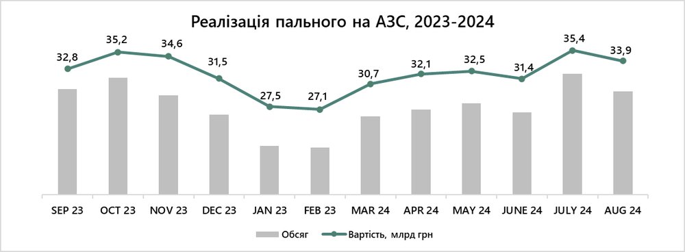 Загальна вартість проданого пального (бензини, дизпальне, LPG) на АЗС у серпні 2024 р. становила 33,9 млрд грн, що на 4,1% менше, ніж у липні, а загальний обсяг проливів зменшився на 4,7%, свідчать дані Державної податкової служби України, проаналізовані НафтоРинком.
