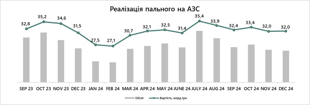Загальна вартість проданого пального (бензини, дизпальне, LPG) на АЗС у грудні 2024 р. склала 32,0 млрд грн, що співставно з показником листопада, а обсяг проливів знизився на 0,7%, свідчать дані Державної податкової служби України, проаналізовані НафтоРинком.