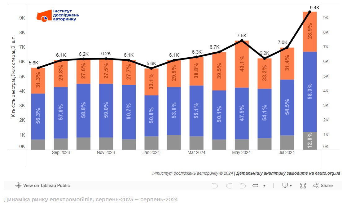 На внутрішні перепродажі припадало 28,9% угод (2724 од.). Новими купили 1209 електрокарів, що на 74% більше, ніж у серпні минулого року.