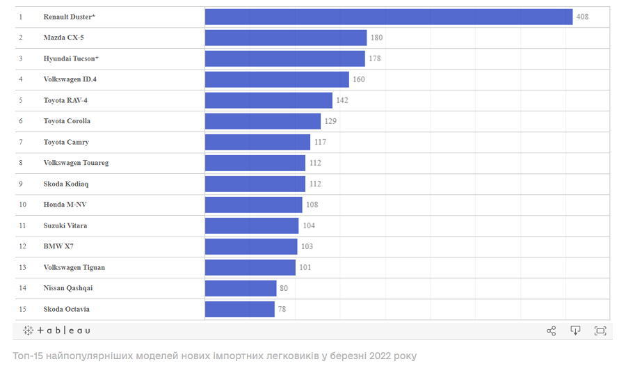Лідером продажів у березні серед усіх моделей з великим відривом від найближчих конкурентів був Renault Duster (408 шт.). На друге місце із четвертого піднялася Mazda CX-5 (180 шт.), а на третє із п’ятого – Hyundai Tucson (178 шт.). Популярний електромобіль Volkswagen ID.4 (160 шт.) опустився із другого місця на четверте.