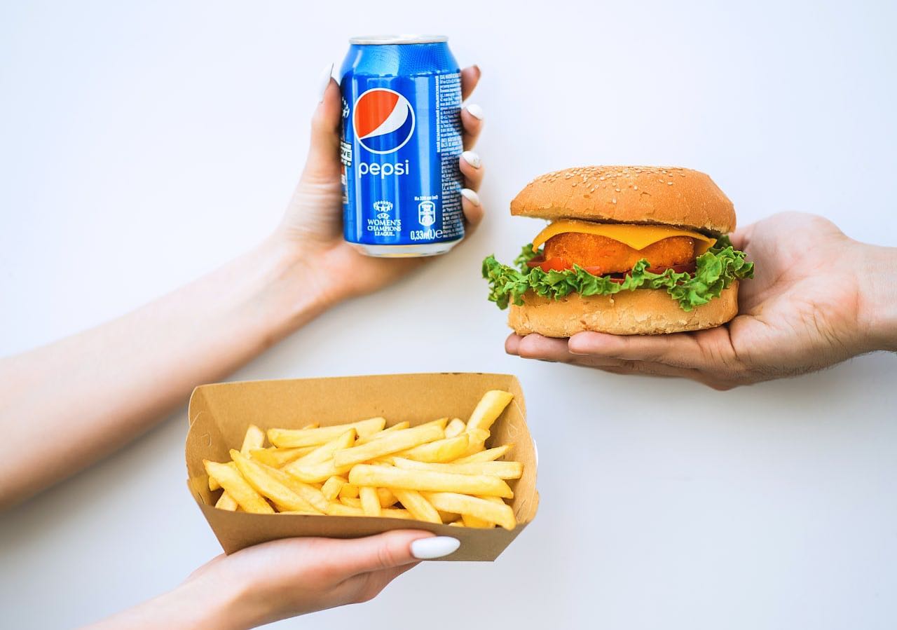Бургер предлагают к продаже в комбо с картошкой и Pepsi.