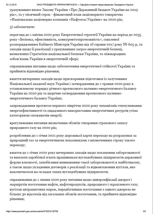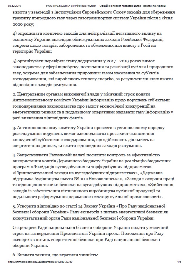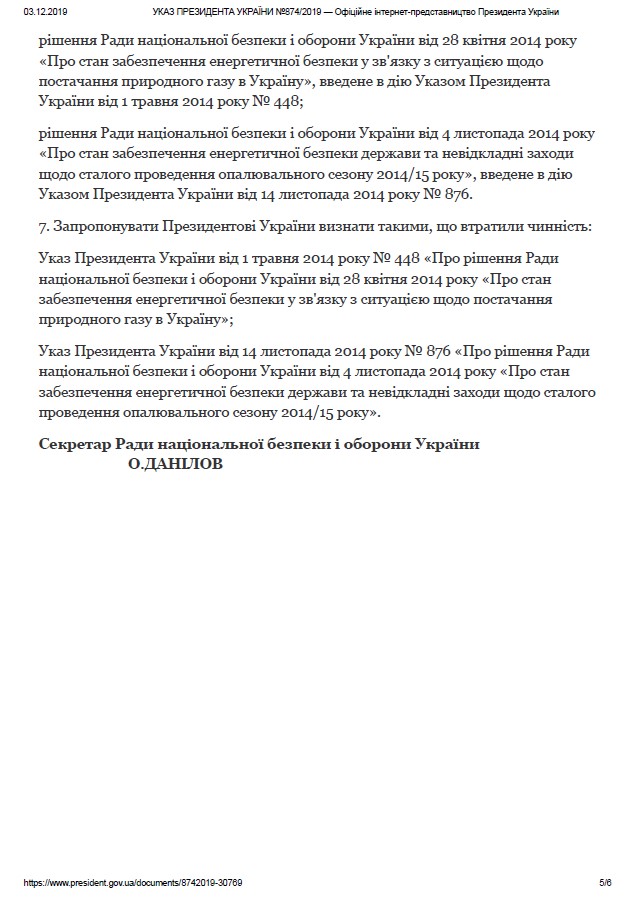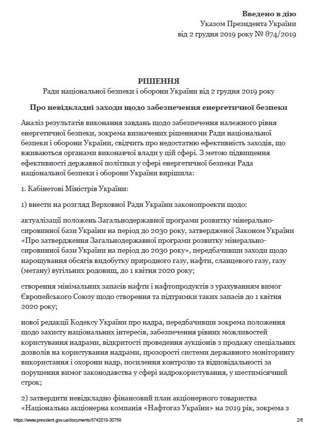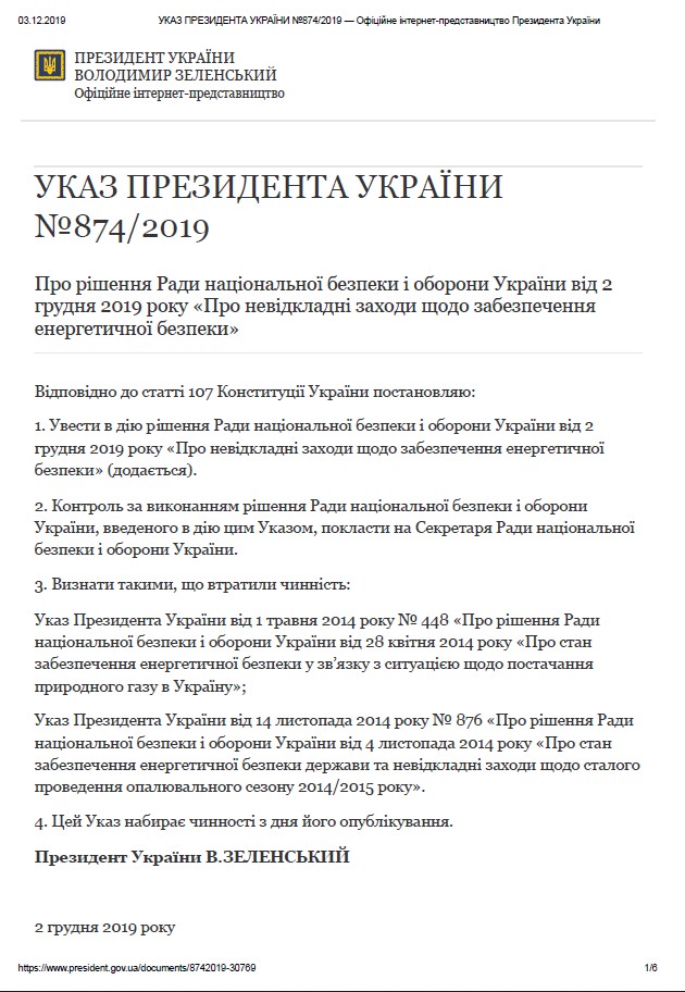 2 декабря 2019 года издан Указ Президента Украины об введении в действие Решения Совета нацбезопасности и обороны Украины от 2 декабря 2019 г «Про неотложные меры по обеспечению энергетической безопасности»