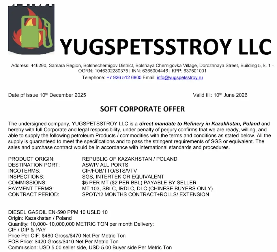 У прикріпленому файлі під назвою Soft Corporate Offer («Попередня комерційна пропозиція») компанія запевняє, що має прямі контракти на постачання пального з нафтопереробних заводів в Казахстані та Польщі.