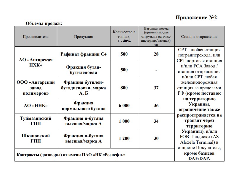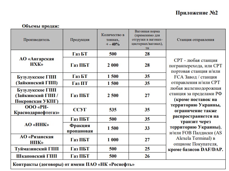 Предложены контракты от имени ПАО «НК «Роснефть» на 10 тыс. т ПБТ отгрузкой в мае 2021 г. производства «Роспан» поставкой до станции погранперехода/ FCA Завод/CPT любая станция, за исключением экспорта, или транзита в/через Украину.