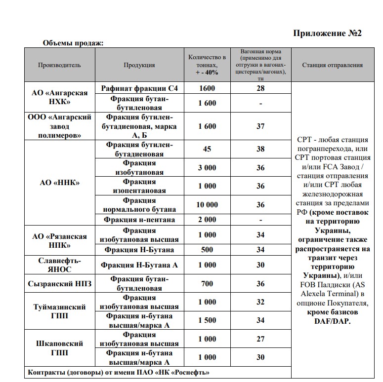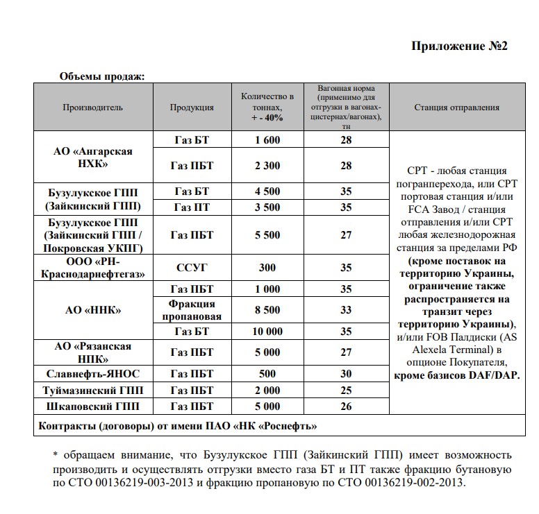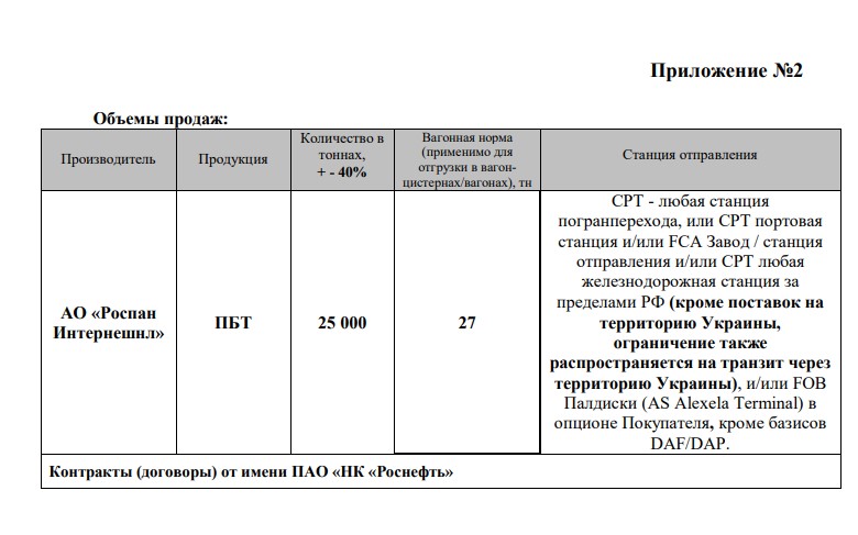 Предложены контракты от имени ПАО «НК «Роснефть» на 25 тыс. т ПБТ (ресурс июня 2021 г.) производства «Роспан» поставкой до станции погранперехода/ FCA Завод/CPT любая станция, за исключением экспорта, или транзита в/через Украину.