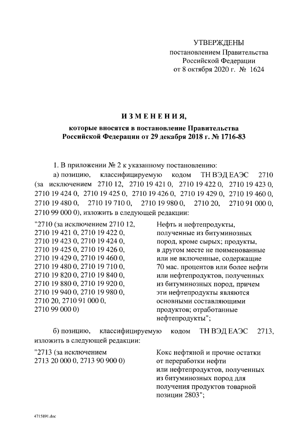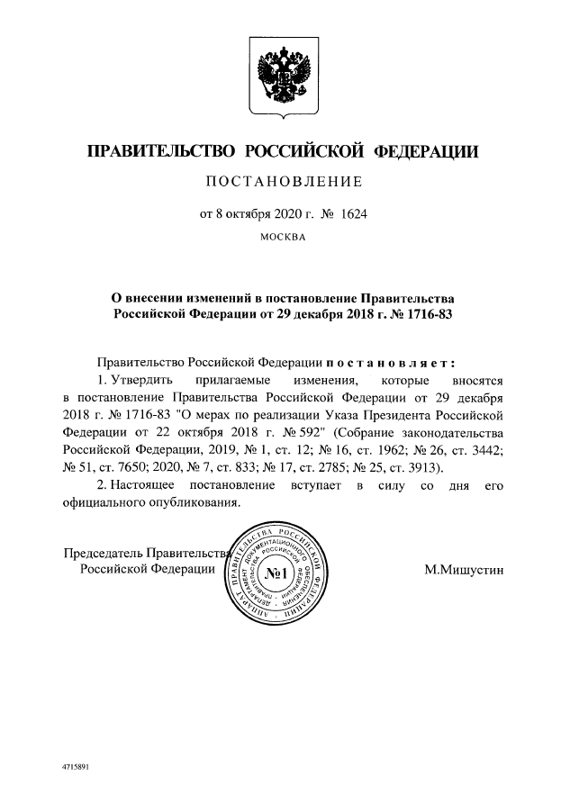 Об этом говорится в Постановлении Правительства РФ от 08.10.2020 № 1624 «О внесении изменений в постановление Правительства Российской Федерации от 29 декабря 2018 г. № 1716-83», которое было опубликовано 12 декабря 2020 года на Официальном интернет-портале правовой информации.