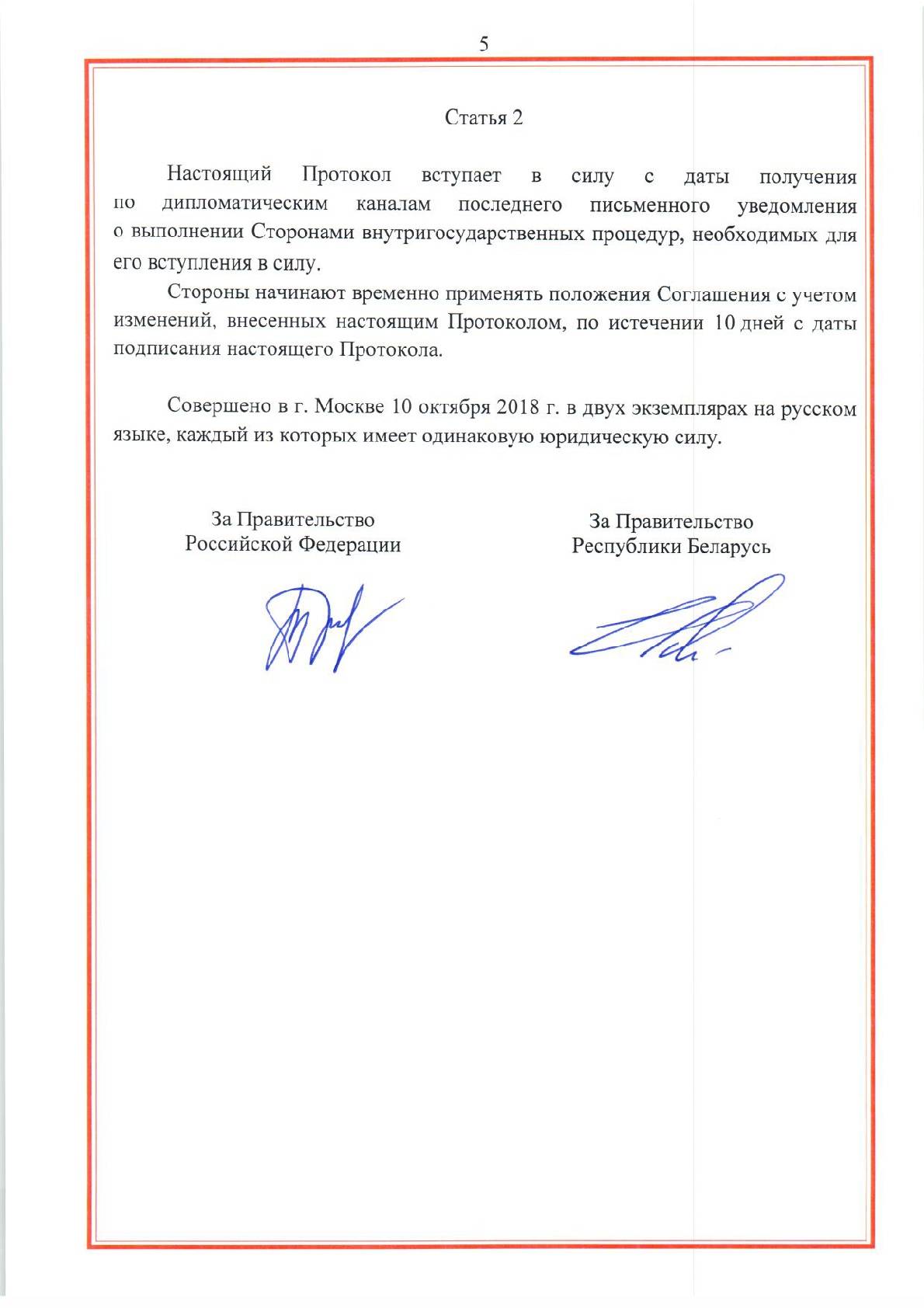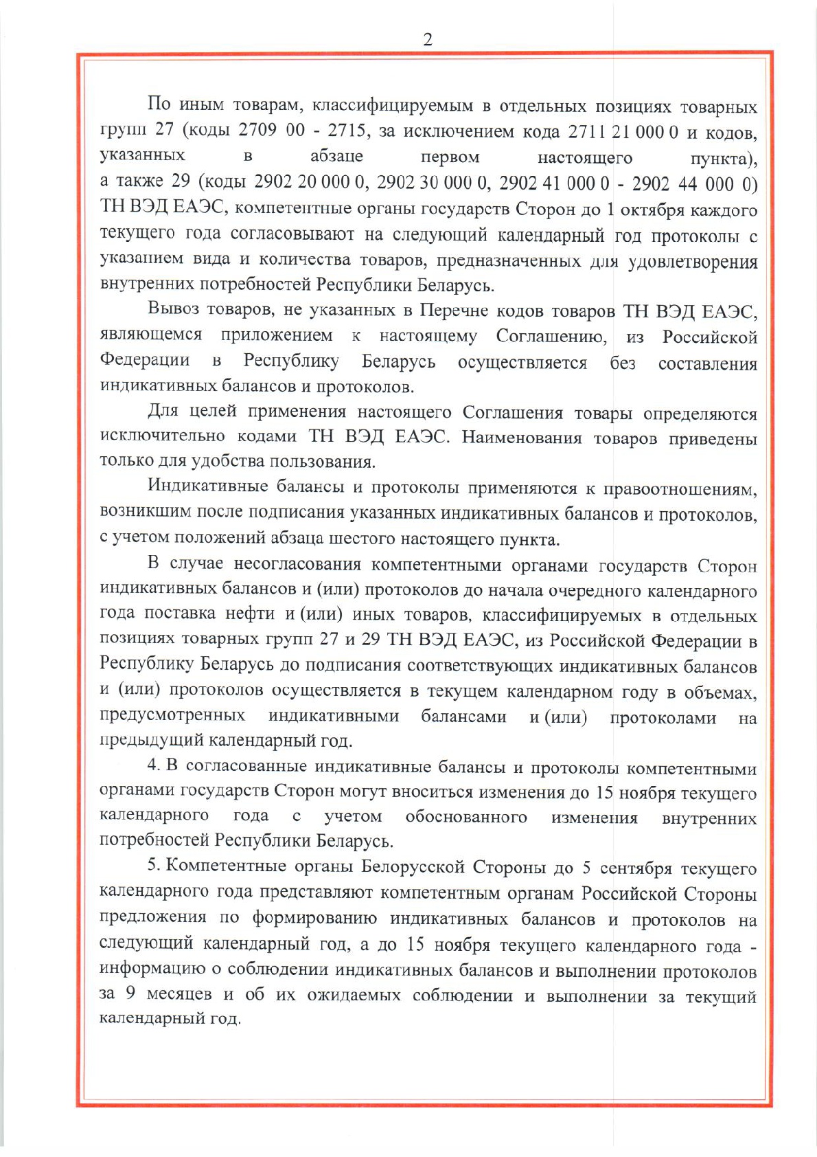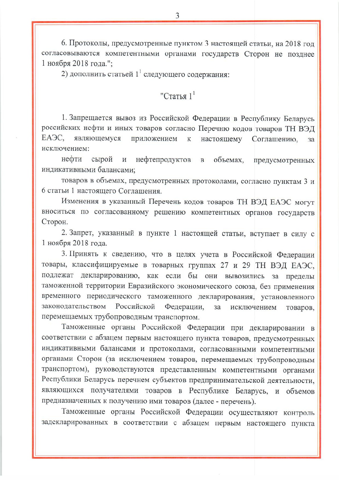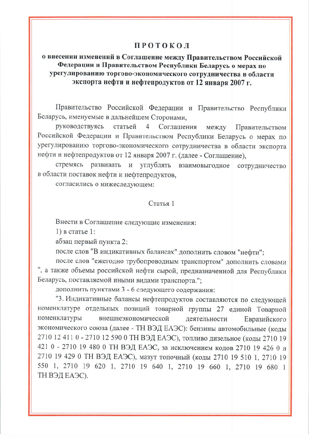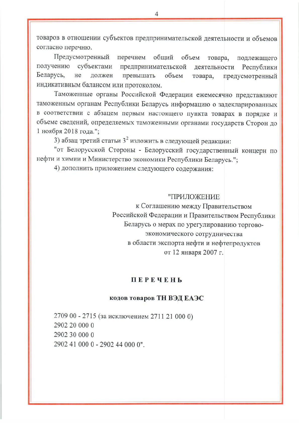Подписанная редакция протокола к межправительственному соглашению по поставкам нефти и нефтепродуктов между Россией и Беларусью, предусматривает введение запрета на экспорт нефти, нефтепродуктов, сжиженных газов и прочих товаров, превышающих объемы индикативного баланса. Протокол предусматривает поставки сырья и нефтепродуктов по индикативным балансам с ноября 2018 года до конца 2019-го года.