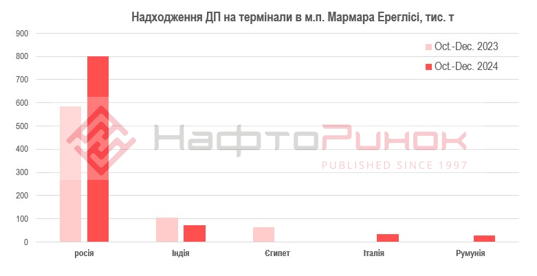 Водночас стрімко скорочується постачання індійського ДП до Мармари. Так, від найбільшого в Індії виробника - Reliance Industries у четвертому кварталі 2024 р. була поставлена лише одна партія 71,6 тис. т, в порівнянні з 104,8 тис. т в жовтні 2023 р. Також, в жовтні 2024 р. та грудні 2024 р. надходили танкери з 33 тис. т з Італії та 28,4 тис. т з Румунії, відповідно.