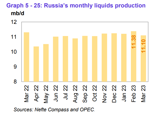Згідно з даними ОПЕК, обсяги видобутку рідких вуглеводнів у Росії у 2021 році становили 10,8 млн бар./добу, в 2022 році – 11,03 млн бар./добу, а в 2023 році знизяться на 0,75 млн бар./добу по відношенню до попереднього року, до 10,28 млн бар./добу. У звіті наголошується, що ці оцінки враховують нещодавно оголошене продовження добровільного скорочення видобутку до кінця року. Зокрема, в ОПЕК очікують, що в ІІІ кв. видобуток нафти в РФ впаде до найнижчого рівня за рік – 9,85 млн бар./добу.