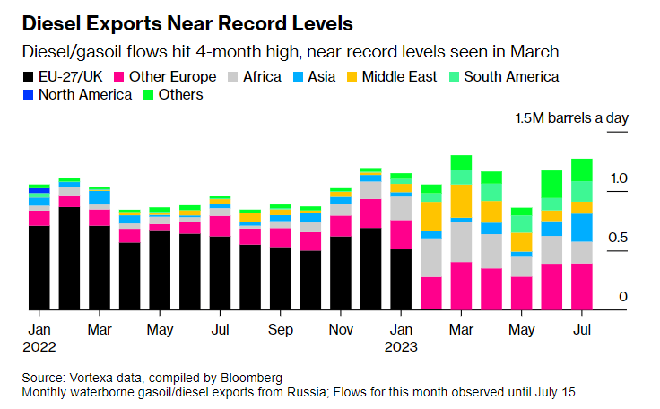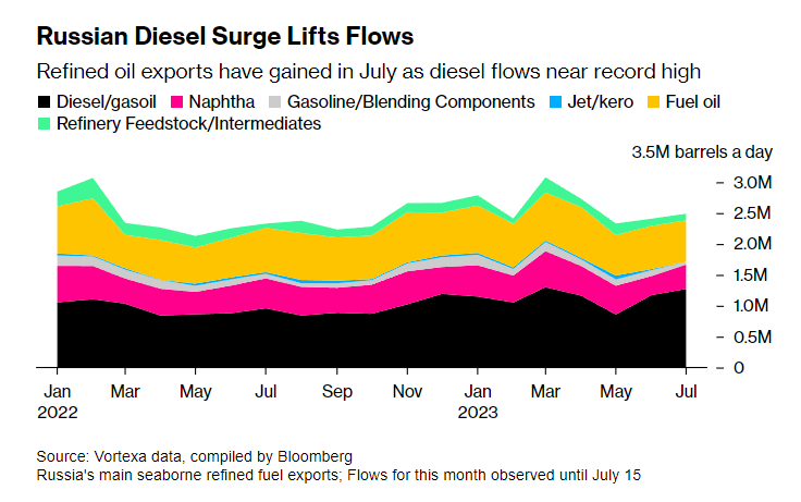 Поставки дизельного палива або газойлю – основного експортного продукту – зросли на 8,5%, до 1,27 млн барелів на добу. Це лише трохи нижче рекордного рівня – 1,3 млн барелів на добу, – зафіксованого в березні, показують дані Vortexa, яка відстежує російський експорт нафтопродуктів з 2016 року. У липні обсягу експорту дизеля були приблизно на 33% вище, ніж за аналогічний період 2022 року.