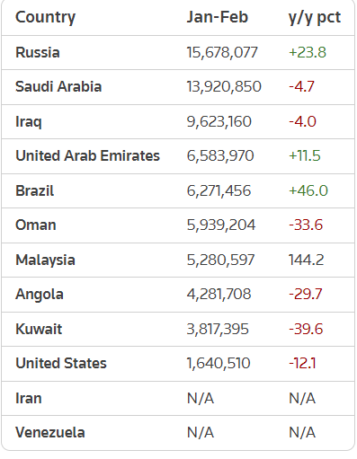 Покупці з Китаю продовжують скуповували російську нафту, яка потрапила під санкції і прдається зі знижками. Згідно з даними Головного митного управління Китаю, у січні-лютому поставки сирої нафти з Росії становили 15,68 млн тонн, або 1,94 млн барелів на добу, що на 23,8% більше, ніж за аналогічний період 2022 року (1,57 млн бар./добу).