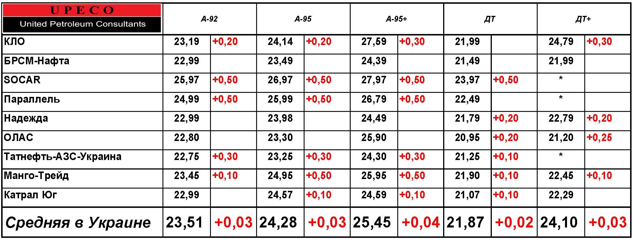 В результате очередного подорожания, средняя стоимость бензинов и ДТ в рознице по состоянию на 1 февраля, достигла следующих отметок: А-92 – 23,51 грн/л, А-95 – 24,28 грн/л, А-95 Премиум – 25,45 грн/л, ДТ – 21,87 грн/л и ДТ Премиум – 24,10 грн/л.