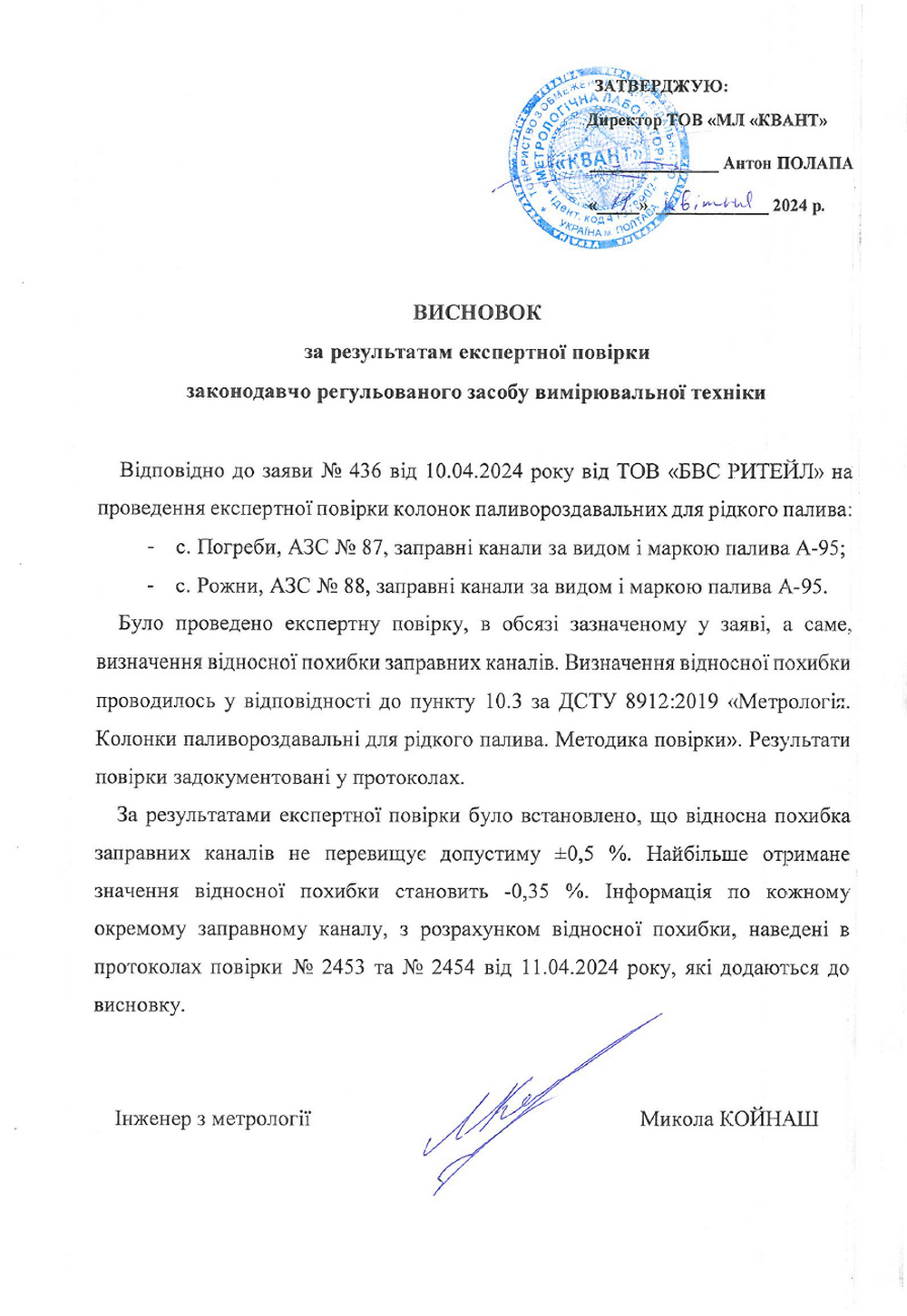 «Одразу після публікацій у ЗМІ та телеграм каналах недостовірної інформації в тому числі про нашу мережу, ми з’ясували, де та в який спосіб відбулась так звана «велика перевірка», і провели власні заміри відпуску пального з ПРК та викликали на станції незалежну компанію для арбітражу. Виявилось, що колонки на двох АЗС – в с. Погреби та с. Рожни (Київська обл.) працюють в межах допустимої похибки: найбільше отримане значення становить -0,35% при нормі 0,5%», повідомили НафтоРинку в BVS. Компанія надала копії висновків метрологічної лабораторії «Квант».