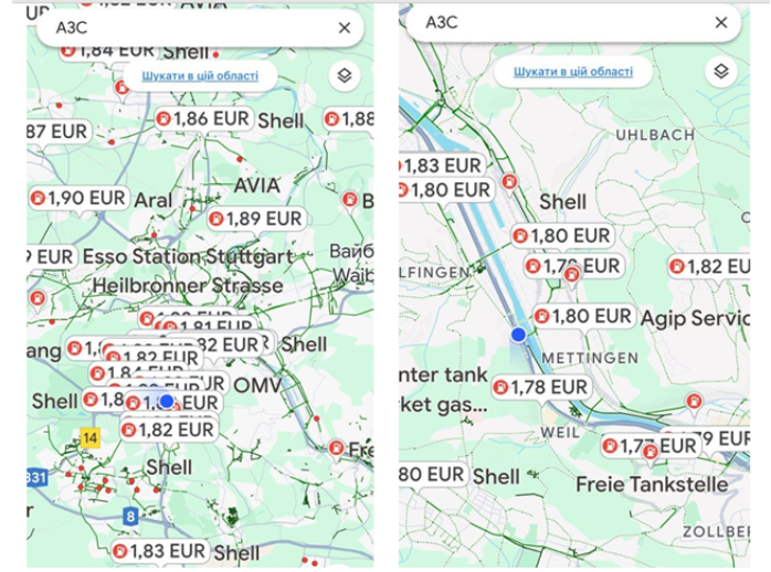 Фото:Результат пошуку АЗС на картах Німеччини, в місті (ліворуч) та на трасі (праворуч).