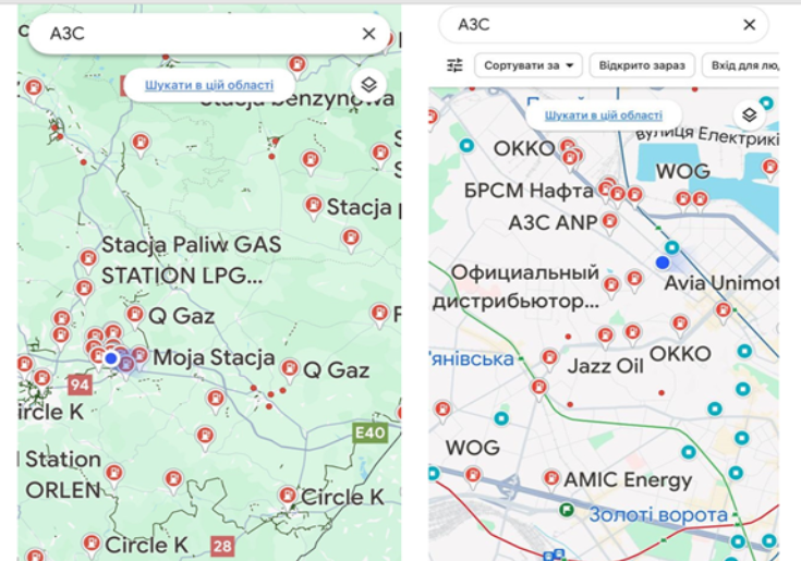 Фото: Результати пошуку АЗС на картах Польщі (ліворуч) та України (праворуч).
