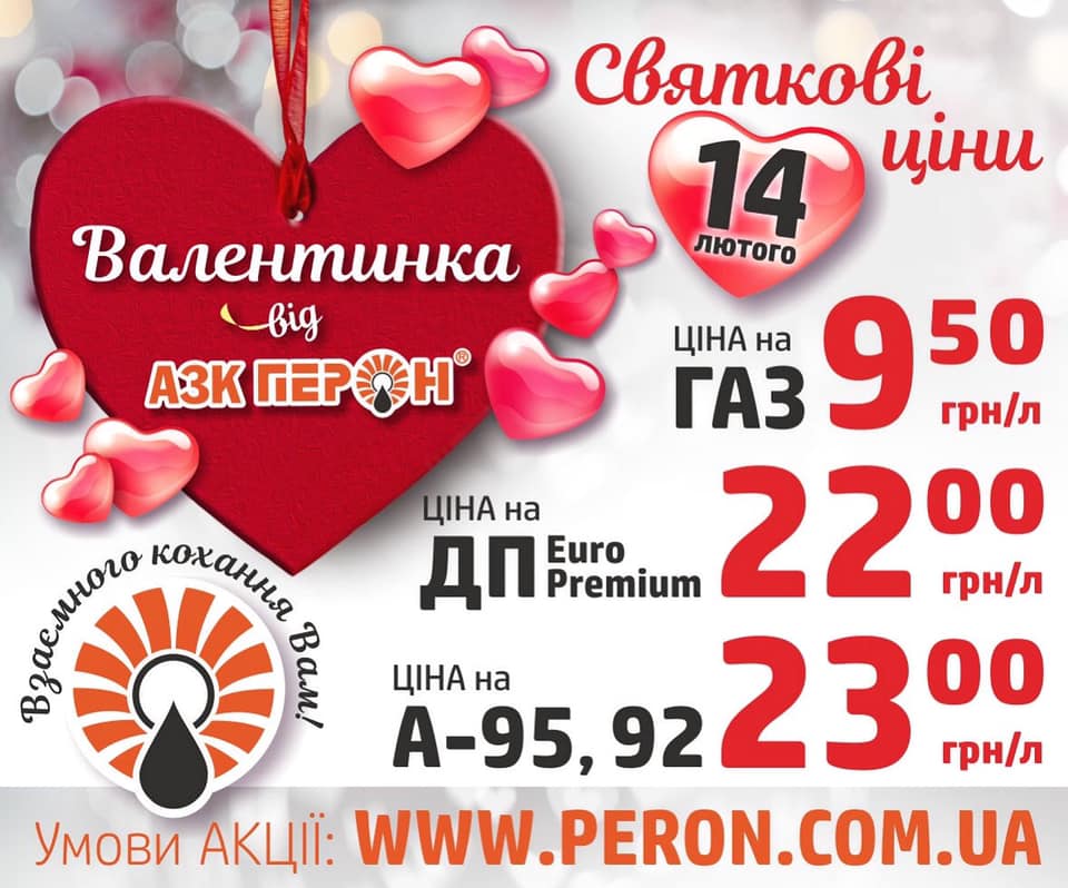 Сеть АЗС Перон в честь Святого Валентина сделает скидки на газ, дизель, бензины. Об этом сообщили в компании.
