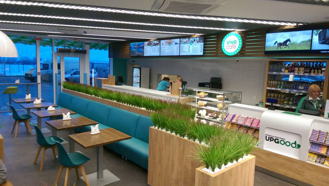 В пристанционном помещении расположен мини-маркет, а также фирменное VIVO-café. Отметим, что это первая АЗС под брендом UPG в Черновицкой области.