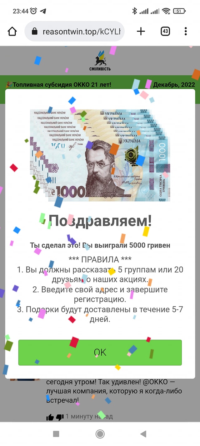 Шахраї почали масово розсилати на різних інтернет-ресурсах повідомлення про паливні субсидії в мережі АЗС OKKO. Клієнти компанії постять скріншоти з такими повідомлення на сторінці OKKO в FaceBook.