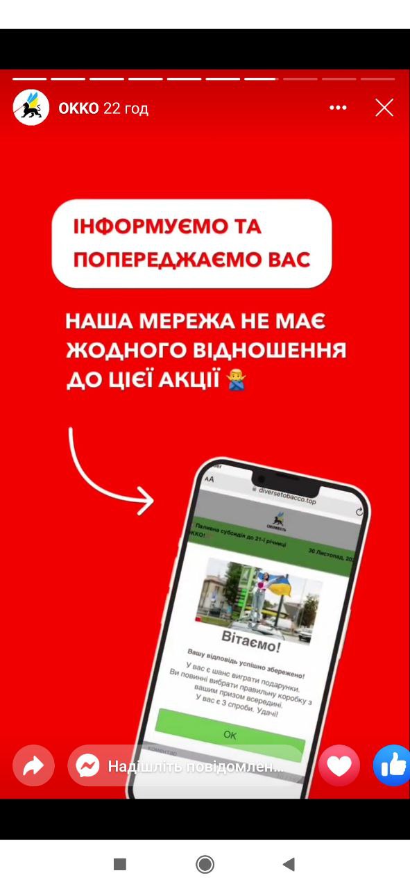 В компанії підкреслили, що мережа не має жодного відношення до цієї “акції”, а також закликали клієнтів довіряти лише повідомленням, розміщеним на офіційних сторінках OKKO.