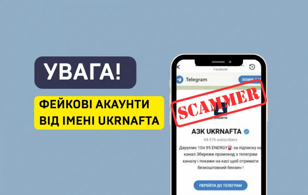 Компанія «Укрнафта» повідомила про розповсюдження в соцмережі Facebook реклами з посиланням на шахрайський акаунт АЗК Ukrnafta у Telegram. Шахраї додали до назви каналу підроблений значок верифікації (синю галочку) та обіцяли користувачам виграти 10 літрів пального за підписку.