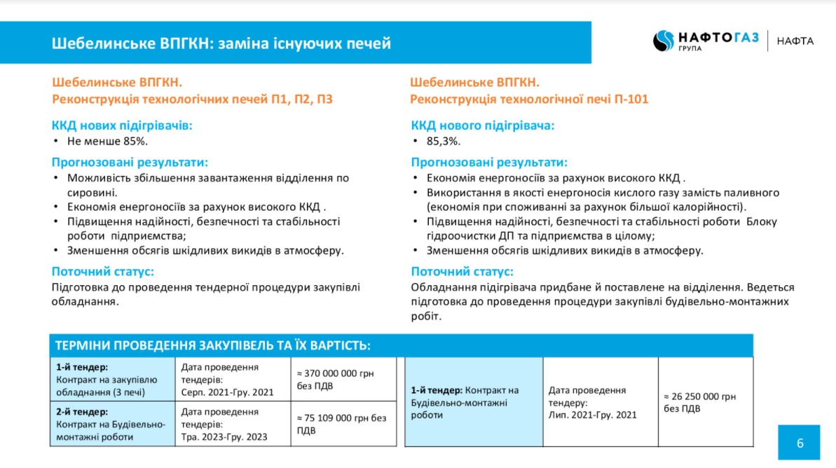 Дата окончания строительства I квартал 2022 г. По словам начальника Шебелинского ОПГКН ПАО «Укргаздобыча» Юрия Рогового новые печи будут вводится в технологическую схему завода во время планово-предупредительного ремонта в апреле 2022 г.