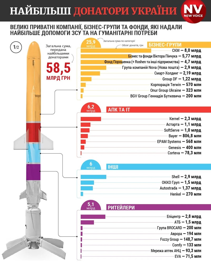 Серед усіх компаній на першому місці за обсягами благодійної допомоги — група СКМ Ріната Ахметова, яка задонатила 8 млрд грн. На другому місці — бізнес та фонди Віктора Пінчука, які пожертвували 5,77 млрд грн. До трійки лідерів увійшли компанії та фонди Петра Порошенка, які задонатили 4,7 млрд грн.