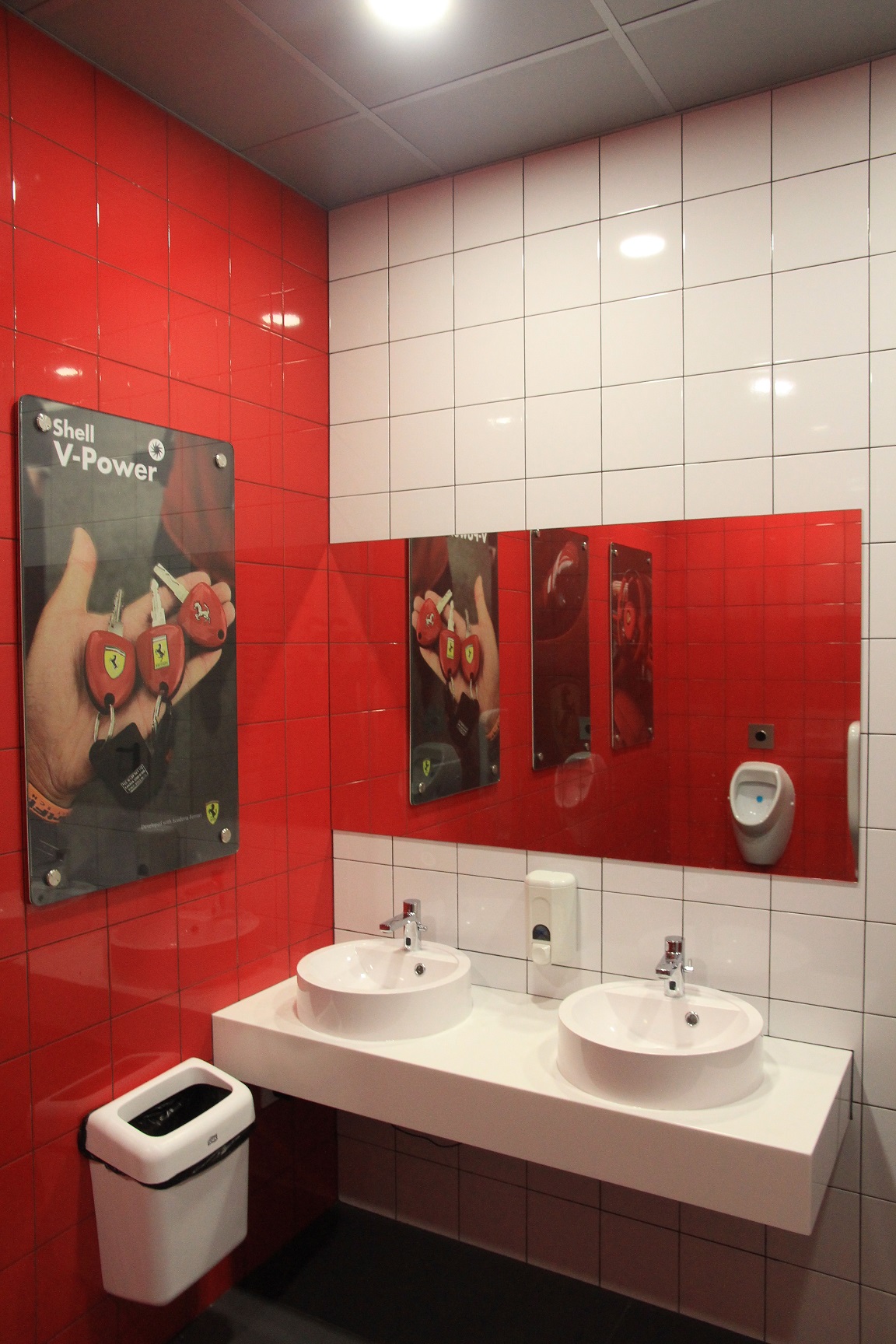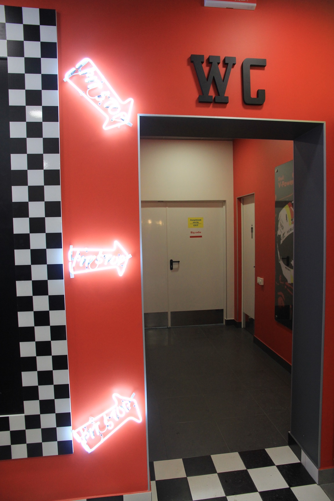 Большой баннер на фасаде с болидом Ferrari готовит клиента к посещению магазина, который может претендовать на звание мини-музея Formula 1. Начиная от пола, на который нанесено изображение дорог, до тематических баннеров с шлемами и флагами на стенах и стендах, заправка Shell пропитана духом гонок.