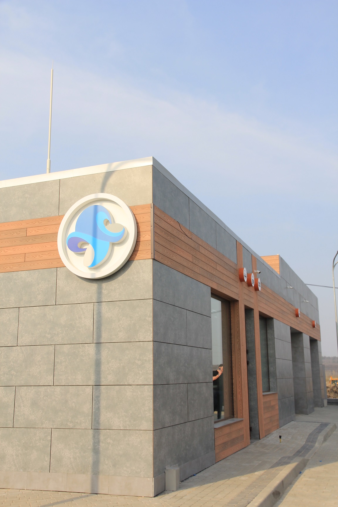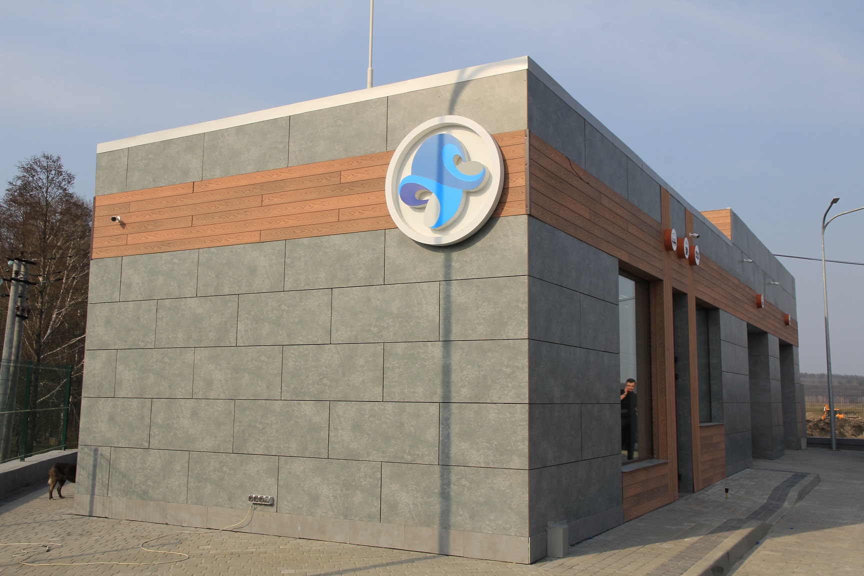 Пристанционное помещение облицовано керамической плиткой в урбанистическом цвете «бетон» с лофтовыми вставками дерева. Сам комплекс включает в себя кафе, маркет с кассовой зоной (два РРО) и отдельной зоной приготовления еды. Также в ближайшее время на станции заработает мойка самообслуживания на два бокса.