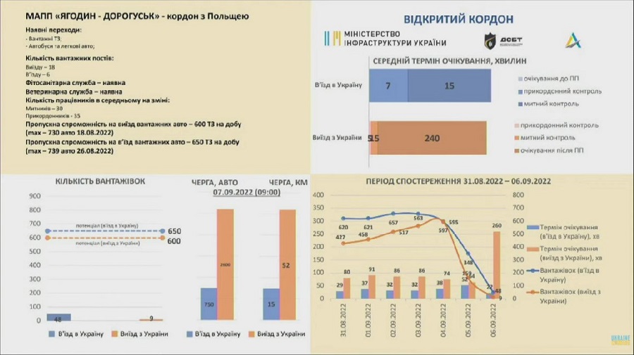 Після консультацій з польськими колегами Міністерство інфраструктури разом з Мінагро, Державною митною та при кордонною службами підготували низку пропозицій, які вже надіслані польській стороні і є всі шанси, що криза буде вирішена. Також Україна готова підготувати і відкрити для позачергового виїзду пустих вантажівок з України до Польщі пункти пропуску «Грушів-Будомєж», «Угринів - Долгобичув» та «Смільниця-Кросцєнко». Потрібна згода і дії від польських колег. Ми також готові спланувати спільні кроки щодо можливості відкриття до середини жовтня поточного року місць перетину державного кордону «Нижанковичі – Мальховіце» та «Варяж – Усьмеж» для тимчасового виїзду незавантажених автомобілів.