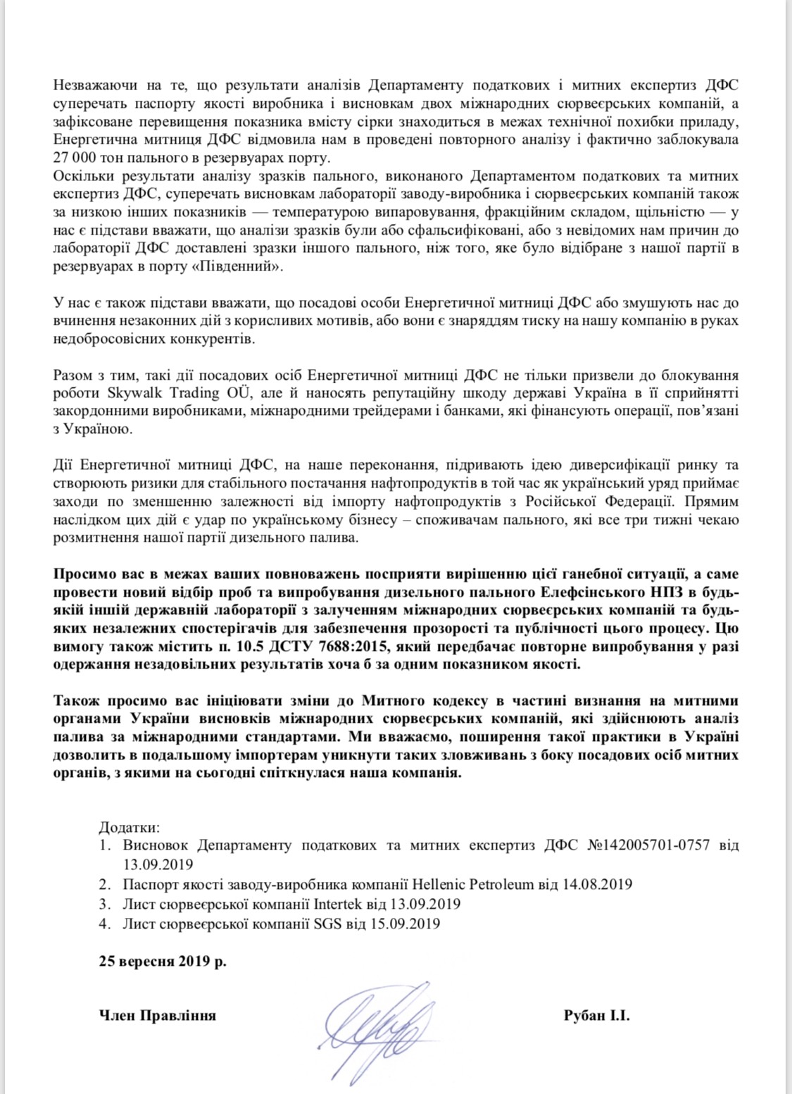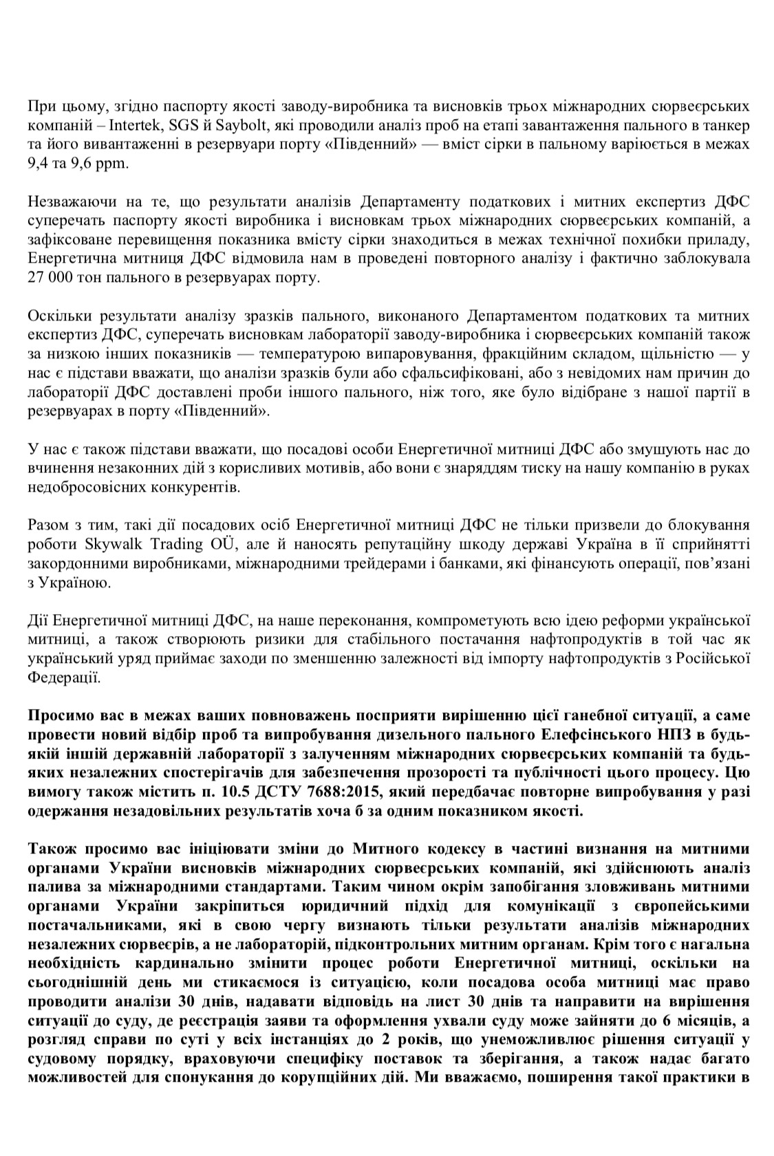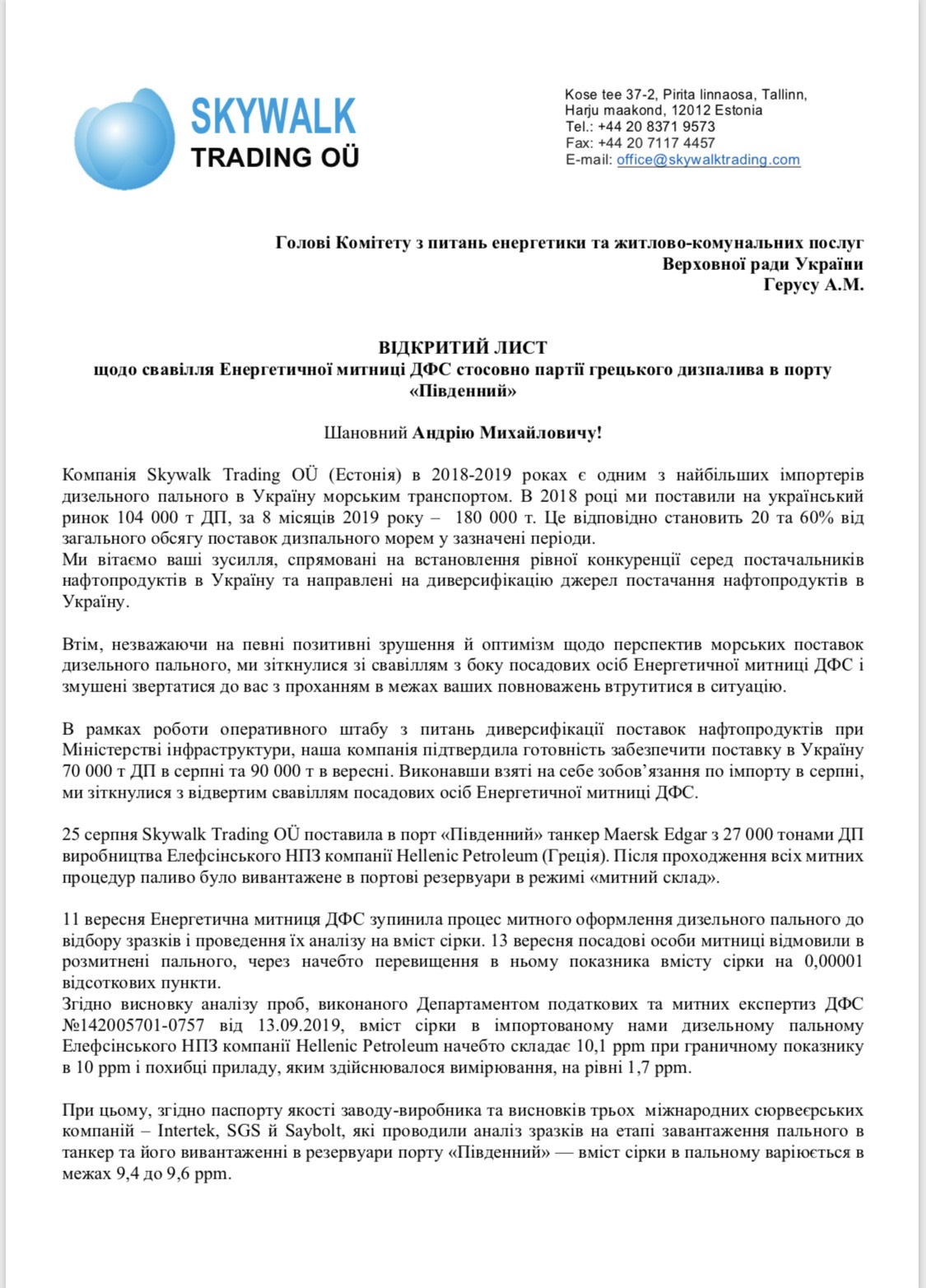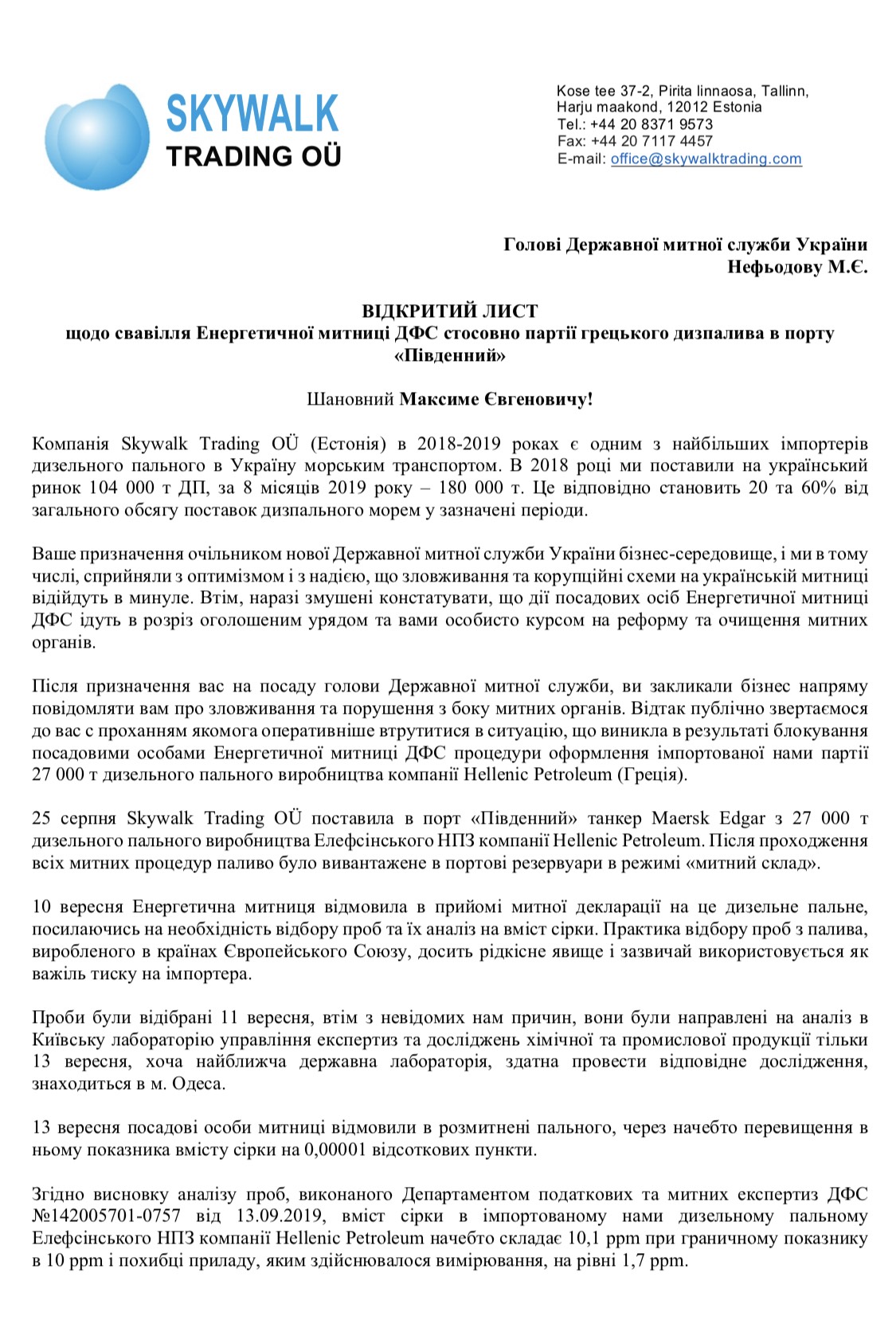 Наша компания откликнулась на призыв правительства нарастить поставки топлива в сложный период после отказа от российского импорта по нефтепродуктопроводу. Однако в ходе выполнения этой программы мы столкнулись с произволом чиновников Энергетической таможни ГФС, в результате чего была заблокирована доставленная нами в порт "Южный" партия дизельного топлива из Греции. Все наши попытки добиться справедливости успехом не увенчались. Мы несем колоссальные убытки и уже были вынуждены развернуть следующий танкер, который должен был прибыть в Южный завтра. Мы решили обратиться с открытым письмом к Андрею Герусу, как активного участника процесса реформирования системы нефтепродуктообеспечения, и к Максиму Нефьодову - главе таможенной службы, призвавшему сообщать о любых злоупотреблениях на таможне. Речь идет об инвестиционном имидже страны, энергобезобасности, а, значит, об интересах каждого украинца, в том числе и меня. - отметила Ирина Рубан, Член Правления Skywalk Trading.