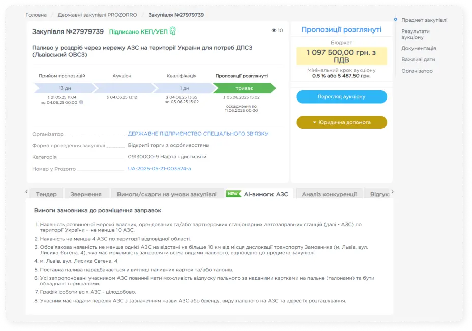 Щоб скористатися новим інструментом, потрібно через е-майданчик перейти на сторінку закупівлі та під описом детальної інформації про тендер знайти розділ New «AI-вимоги: АЗС». Додаткові налаштування не потрібні.