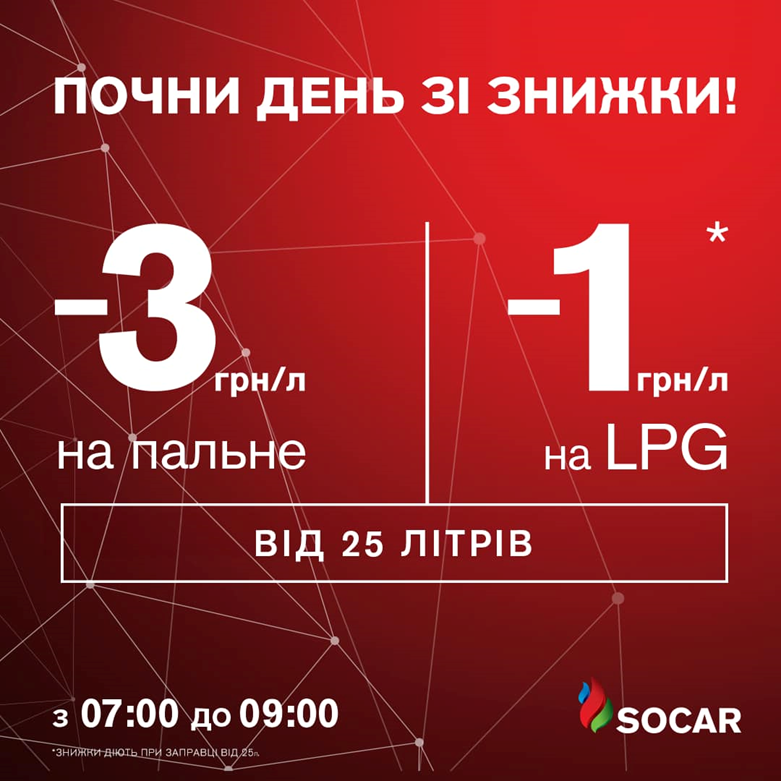 Щоб отримати знижку, необхідно з 7-ї до 9-ї ранку здійснити заправку пальним від 25 л та надати для сканування картку лояльності level. Знижка автоматично зараховуватиметься в чек. Акція діятиме на всіх АЗС SOCAR в Україні.