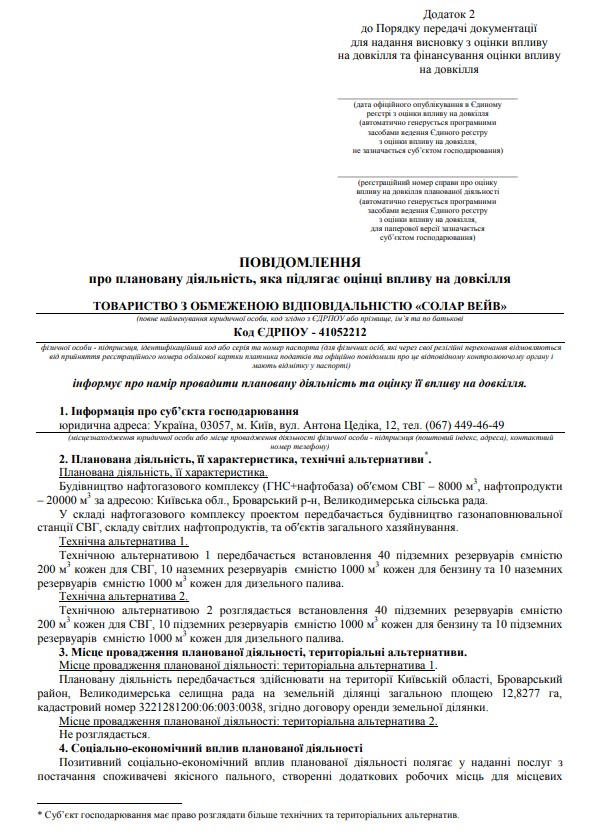 Согласно сообщения о плановой деятельности, опубликованного в реестре оценки влияния на окружающую среду, компания «СОЛАР ВЕЙВ» (код ЕГРПОУ 41052212) планирует строительство топливного хаба в Великой Дымерке (Броварской район, Киевская область) общей емкостью хранения на 8 тыс. м куб. LPG (4 тыс. т) и 20 тыс. м куб моторных топлив.