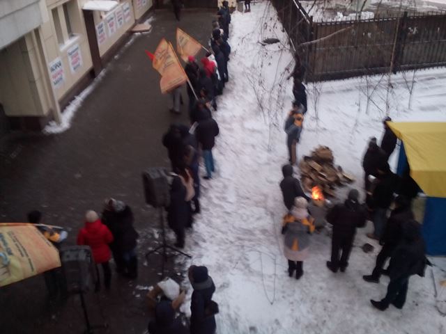 Около 30 работников компании митингуют вдоль входа в здание ГФС с флагами «БРСМ-Нафты» и плакатами с надписями «Налоговая отбирает частный бизнес», «Остановите рейдера Билана», «Требуем исполнения решения суда». Митингующие установили палатку и развели костёр на клумбе у здания.