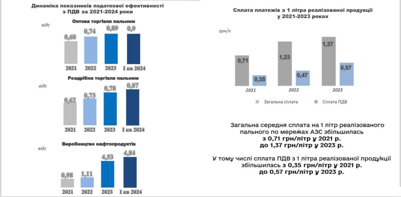 Згідно з даними Гетманцева, в секторі гуртової торгівлі пальним ефективність сплати ПДВ зросла з 0,6 у 2021 році до 0,9 у І кварталі 2024-го. На роздрібному ринку пального цей показник збільшився з 0,62 у 2021 році до 0,87 за перші три місяці 2024 року.