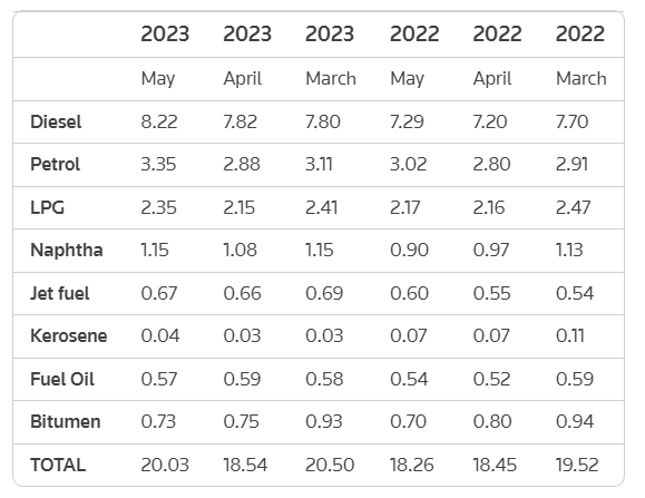 Загальний обсяг споживання палива, який є показником попиту на нафту, в травні становив 20,03 млн тонн проти 18,54 млн тонн у квітні.