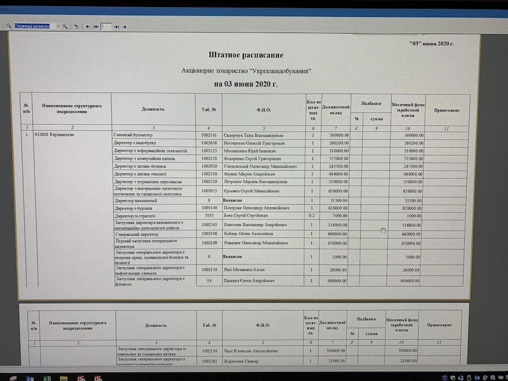 Місячні посадові оклади першої структурної одиниці «Керівництво» АТ «Укргазвидобування» оприлюднив цього тижня в соцмережі один з колишніх співробітників держкомпанії. Згідно документу, опублікованого в групі «За чесний Нафтогаз» у facebook, більшість керівників, включно з гендиректором УГВ Оленою Кобець в червні 2020 р. отримували зарплату від $10 до $33 тис. на місяць (за курсом 26,7 грн/$). Крім того, оклади декількох заступників набагато вищі за керівника.