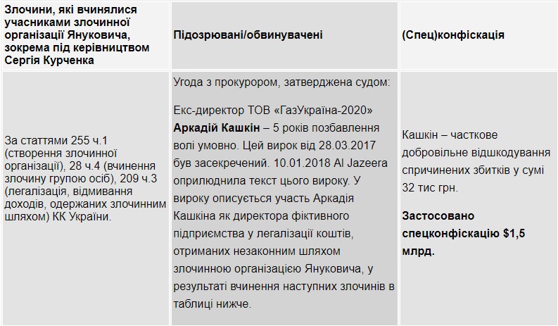 Как указывает следствие, в период с марта 2010 года по февраль 2014 преступная организация Януковича беспрепятственно существовала на территории Украины и России, что позволило С.Курченку совместно с другими руководителями преступной организации спланировать и организовать совершение ряда тяжких и особо тяжких преступлений в ТЭК и банковской сфере всего на общую сумму более 13,24 млрд грн.