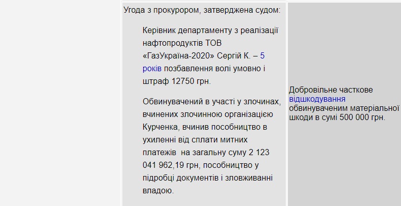 Ниже собраны приговоры по фигурантам т.н. «Группы Курченко», которые удалось отыскать в государственном реестре судебных решений или о них стало известно из официальных заявлений руководителей ГПУ. Все эти лица пошли на сделку со следствием.