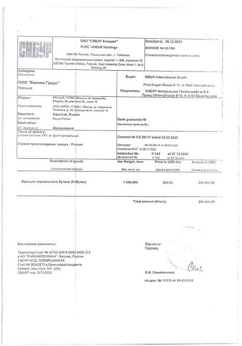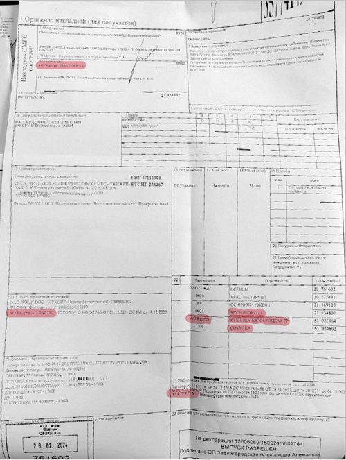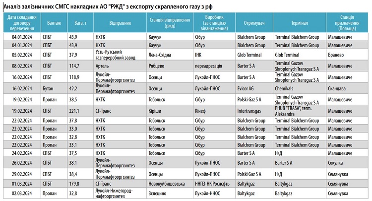 Встановлено, що оператор LPG-терміналу у м. Сокулка – Barter S A (Польща) – найбільший постачальник LPG з Польщі до України, отримав щонайменше 0,3 тис. т залізничних партій скрапленого газу виробництва заводів «Лукойлу» та «Сібуру». На термінал Bialchem Group надійшло більше 0,2 тис. т ресурсу з заводів «Сібуру» та «Уралоргсинтезу». Baltykgaz прийняла більше 0,2 тис. т газу відвантаженого переважно з ст. Новокуйбишевська (станція відвантаження газу НПЗ «Роснєфті»). На Glob Terminal у м. Бранево на початку лютого 2024 р. з Усть-Кутського газпереробного заводу (ІНК) відвантажена цистерна суміші скрапленого газу. Польська компанія «Інтертрансгаз» (Intertransgas) отримала 0,2 тис. т LPG виробництва заводу «Кірішінафтаоргсинтез» (Кінеф) з перевалкою на терміналі PHUB «TRASA», term. Aleksandra в Малашевичах. Також, відправлення ресурсу Пермського НПЗ («Лукойл») здійснювалися на адресу торговельної компанії Evicor AG (Швейцарія). Польська Polski Gaz S A перевантажила на терміналі Transgaz S A в Малашевичах залізничну партію з Тобольську (Сібур), та ще цистерну ресурсу Пермського НПЗ (Лукойл) отримала на ст. Семянувка.